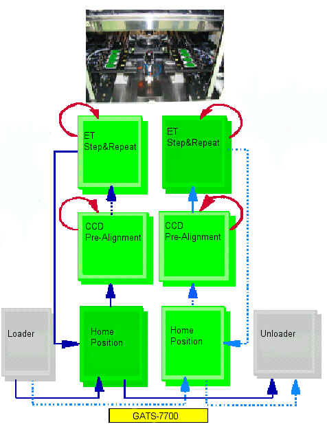 The GATS-7700 Shuttle Handler system is one in a series of test systems for testing multiple-image panels. Rather than buying a fixture for your entire panel, you simply fixture for one (or more) images. The GATS-7700 will then Step the fixture across the entire panel and Repeat the electrical test at each step. The GATS-7700 Shuttle Handler automatically loads two panels into its two handlers. These handlers alternately deliver the panel to the pre-alignment and electrical test areas as shown below. While one panel is being pre-aligned the other is being electrically tested. The result is .... maximum throughput.